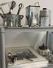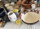 Pottery barn French dinner plates and luncheon size, napkin rings, white pampered chef dishes, Vintage Bennington Pottery mixing bowls, plasticware, yoghurt maker, insta pot, blue and white dishes, insulated fabric picnic basket, bakeware, bundt pan, muffin pans