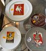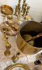 antique woven basket, old metal Remington sign, enamelware, stools and old 1950s/60s metal chairs, flip top table, large selection of Fire King Delphite blue dishes- unusual, also large selection of Asiatic Pheasants dishes- mostly antique a few repro pieces, African art, galvanized, brass- tons, trays, candlesticks, boxes, 2 large tureens/cauldrons, utensils, incense burners, Antique French desk set, many old pictures,