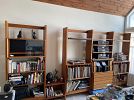 ALSO a 4 bay unit Cado wall system by: Poul Cadovius; 4 white leather dining chairs - Vamdrup Stolefabrik;