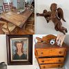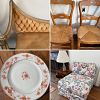 Are you ready for this: Antique 1800’s Farm Table, Set of 6 English 19th century country rush seat chairs, Antique rush seat kneeler chair, Antique ladder back chairs, Brass fireplace fenders, Antique pine tavern table, Antique Cupboard, Antique slat front desk, wing chairs, Antique carved angel, Antique kidney shaped console table with inlay, English butler’s table, Beautiful carved coffee table, Victorian bamboo hall tree, Antique cabinets, dressers, Wrought iron bench and outdoor furniture, Vintage chintz chaise, Antique 19th century dressing mirror, John A. Colby & Sons Dresser