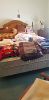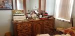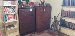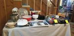 Household items including dishes, utensils, silverware, glassware, dehumidifier, pots and pans, small appliances, Tupperware, knife sets, pots and pans, stemware, bedding, yarn, craft items, sewing machine, holiday items, rugs, metal storage cabinets, file cabinet, desks, Queen bed with two matching dressers, kitchen table and chairs, sleeper sofa, arm chairs, bookcases, small tables, dressers, and much more.