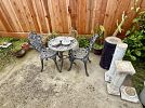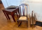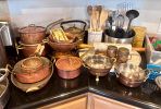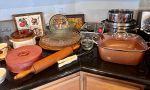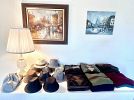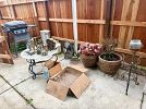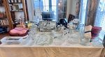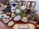 Antique furniture, Asian decor, couch, loveseat, coffee table, end tables, clocks, artwork, decanters, paper weights, dining table, china hutches, china sets, silver plate, Franciscan Apple dish set, pots and pans, copper pots, glassware, Corelle, refrigerator, small appliances, crystal, bookshelves, cookbooks, bar stools, VHS, DVDs, beer tankards, Men’s clothes and shoes, books, dresser & night stands, games, TVs, CDs, linens, desks, antique dresser, luggage, Christmas, pet supplies, gardening supplies and tools, BBQ, tools, plant stands & flower pots, outdoor bistro sets, plants, tool chest, and much more