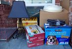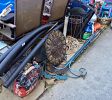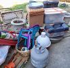 large wine rack, large abstract painting, propane tank with propane, dog crate, Toolbox Vac,