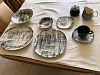Dishes. Set of 2 brass lamps, small And large casserole dish, pie plate, meat platter, exercise mat, set of 6 SS silverware, heating pad, wall pictures ETC