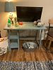 Round dinette table 48”(decorative brad trim) with four upholstered chairs, several side tables and entry hall tables, craft...