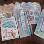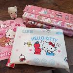 five cute hello Kitty pens, one small hello Kitty notebook, A pack of hello Kitty wipes, A small hello Kitty figurine