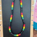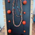 Three necklaces - One very long neck necklace with orange beads One wood beaded necklace. One Wood beaded necklace with turquoise beads.