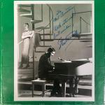 Black and white photograph featuring a piano player and a woman standing on a staircase. Includes a handwritten inscription addressed 'To Neil Armstrong, With eternal best wishes' and signed. The...