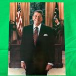 This is a printed photograph of Ronald Reagan, the 40th President of the United States. The image shows him standing in front of the presidential desk inside the Oval Office, with an American flag...
