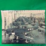 Photograph depicting a World War II-era aircraft assembly line featuring numerous American fighter planes with U.S. markings. Measures approximately 24 x 18 inches. Condition appears good with some...
