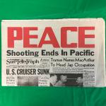 Original 1945 edition newspaper announcing the end of World War II in the Pacific, featuring headline 'Peace: Shooting Ends In Pacific.' Published by Sun-Telegraph featuring major wartime events,...