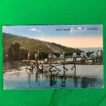 Oblong postcard printed with a scene depicting bridge construction over a water body. Caption reads: 'Unsere tapferen Pioniere beim Brückenbau.' Postcard dimensions are approximately 5.5 x 3.5...