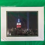 A mounted print of the Empire State Building illuminated in red, white, and blue, with the 9/11 Tribute in Light visible in the background. The print is matted and enclosed in a protective clear...