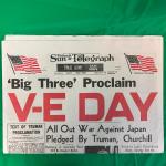Pittsburgh Sun Telegraph newspaper dated likely to May 8-9, 1945. Features headline 'Big Three Proclaim V-E Day,' marking allied victory in Europe during World War II. Includes articles about...