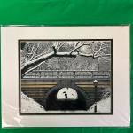 Framed photograph of a snow-covered scene in Central Park. The image captures a bridge and a walking figure beneath, with trees in the background. Mounted on a green mat. Specific dimensions of the...