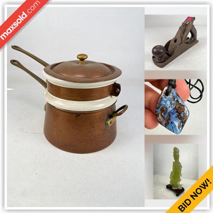 WHAT IS IN THIS AUCTION? This online auction features women’s clothing, smoking pipe, art pottery, power tools, decanter, decorative plates, brass collectibles, wood carvings, art glass, vase...